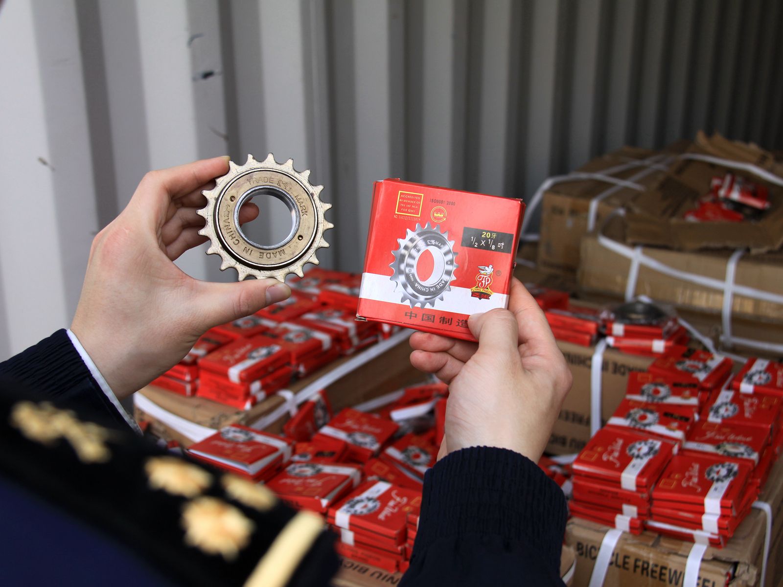 日前天津海关下属新港海关查验关员在对天津某外贸公司申报出口的一批自行车零件进行查验时发现,实货中5000件飞轮的包装盒上印有“飞鸽”图形商标,被确认为侵权商品。